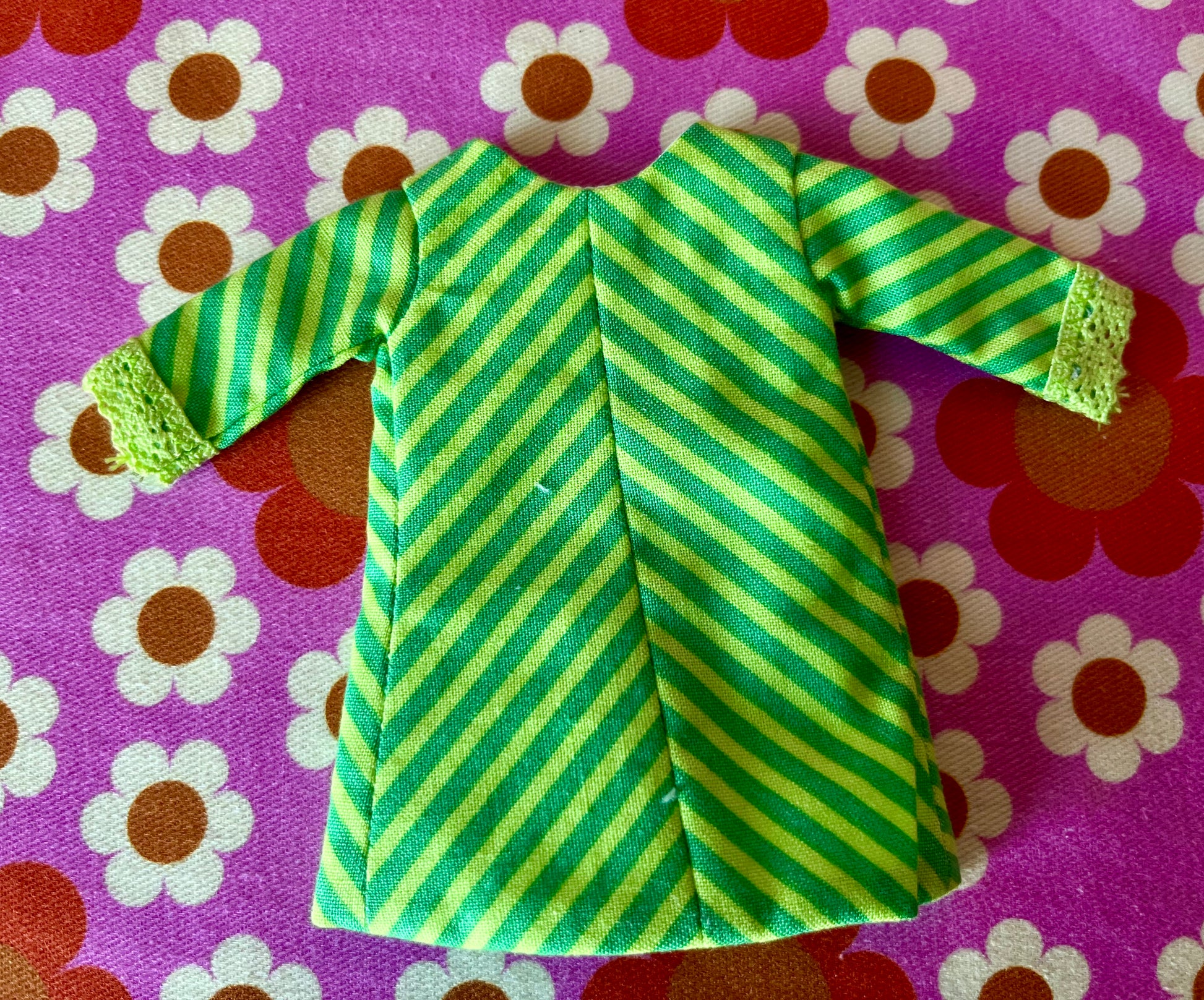 🌸 Shift Dress is fully lined with long sleeves with delicate lace trims appliqué daisy at the neckline . Fabric is a striped print cut into a chevron at the centre seam.