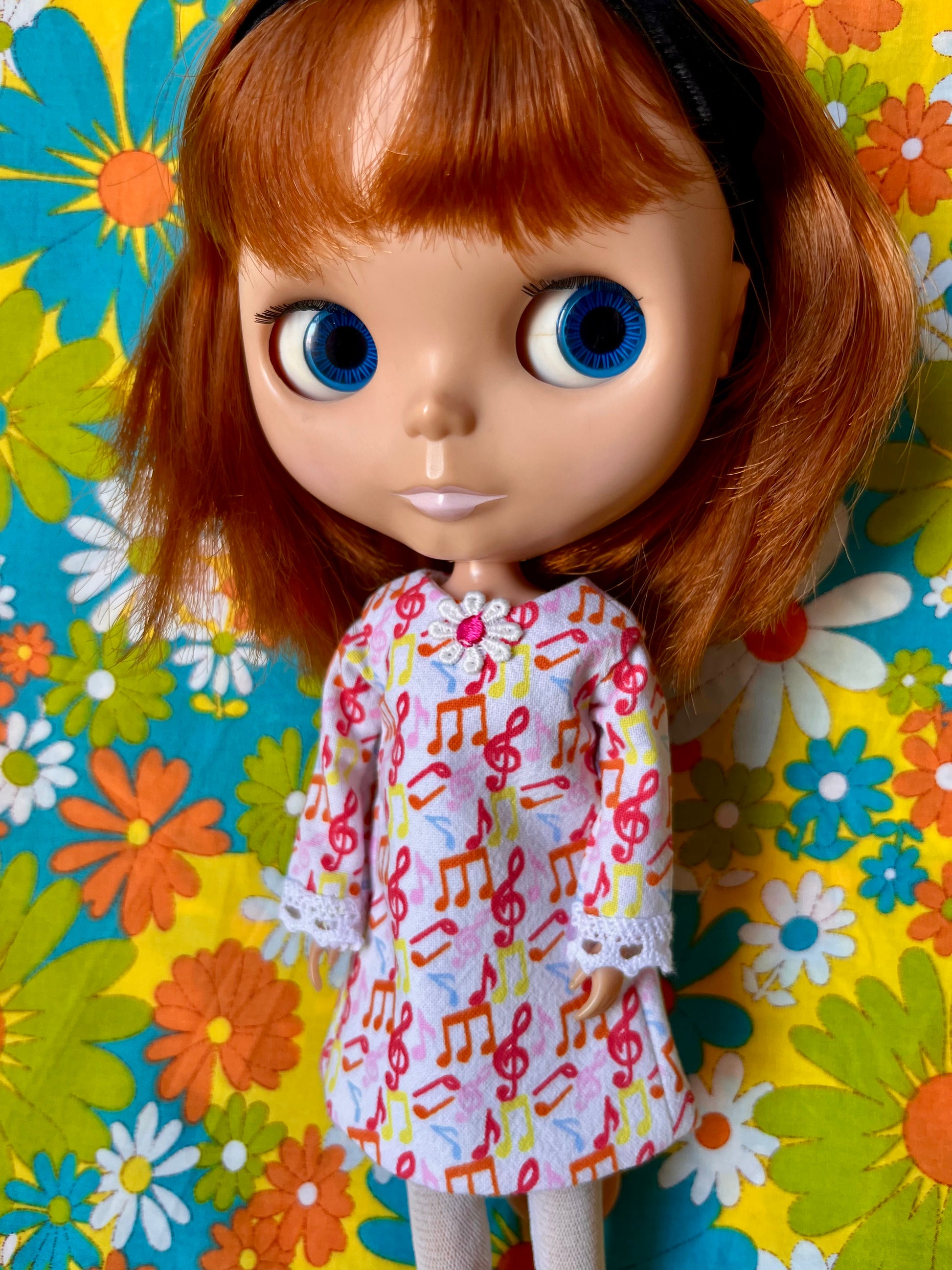 🌸 Shift Dress is fully lined with long sleeves with delicate lace trims appliqué daisy at the neckline . Fabric is a music print cotton.