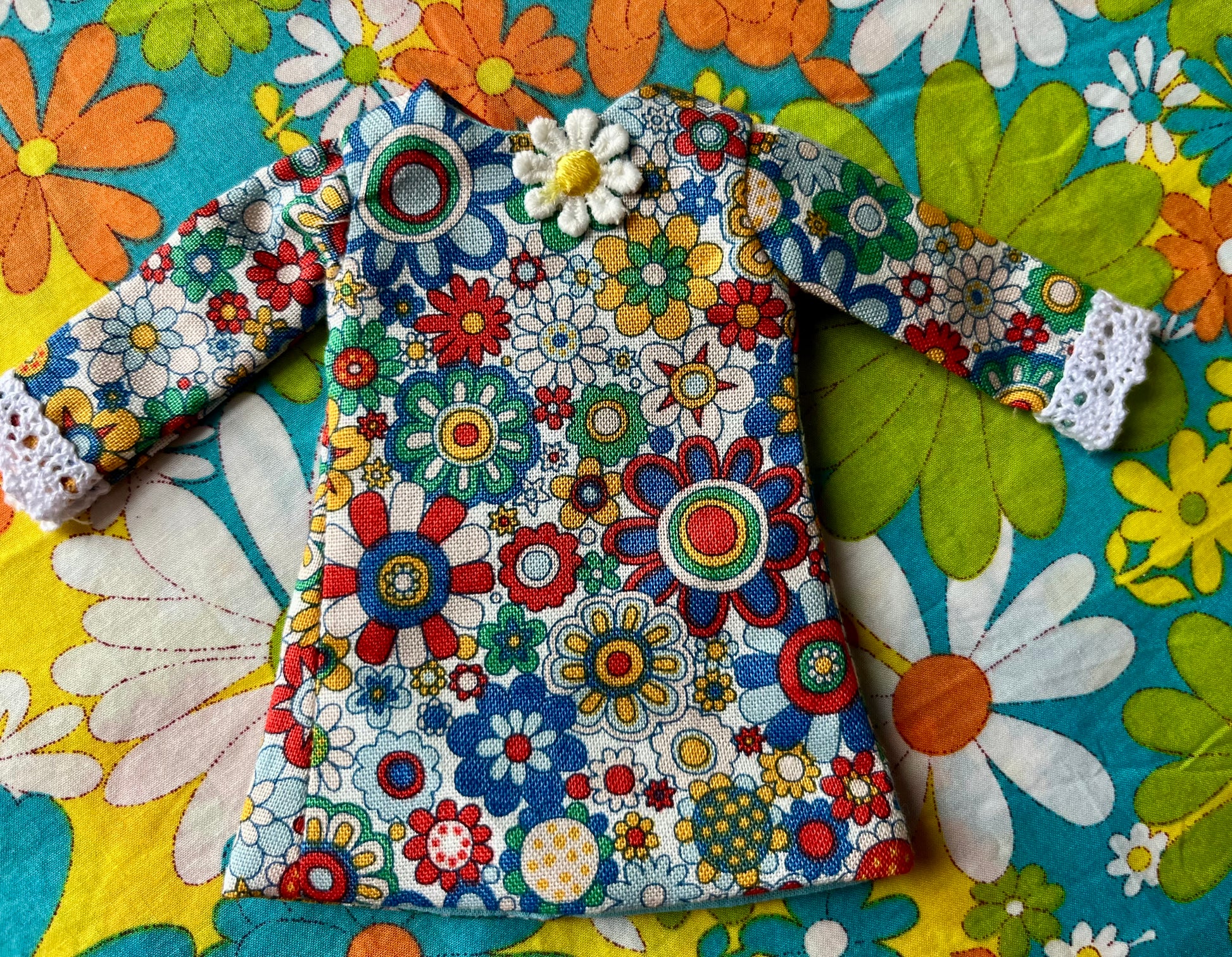 🌸 Shift Dress is fully lined with long sleeves with delicate lace trims appliqué daisy at the neckline . Fabric is a Liberty print daisy cotton.
