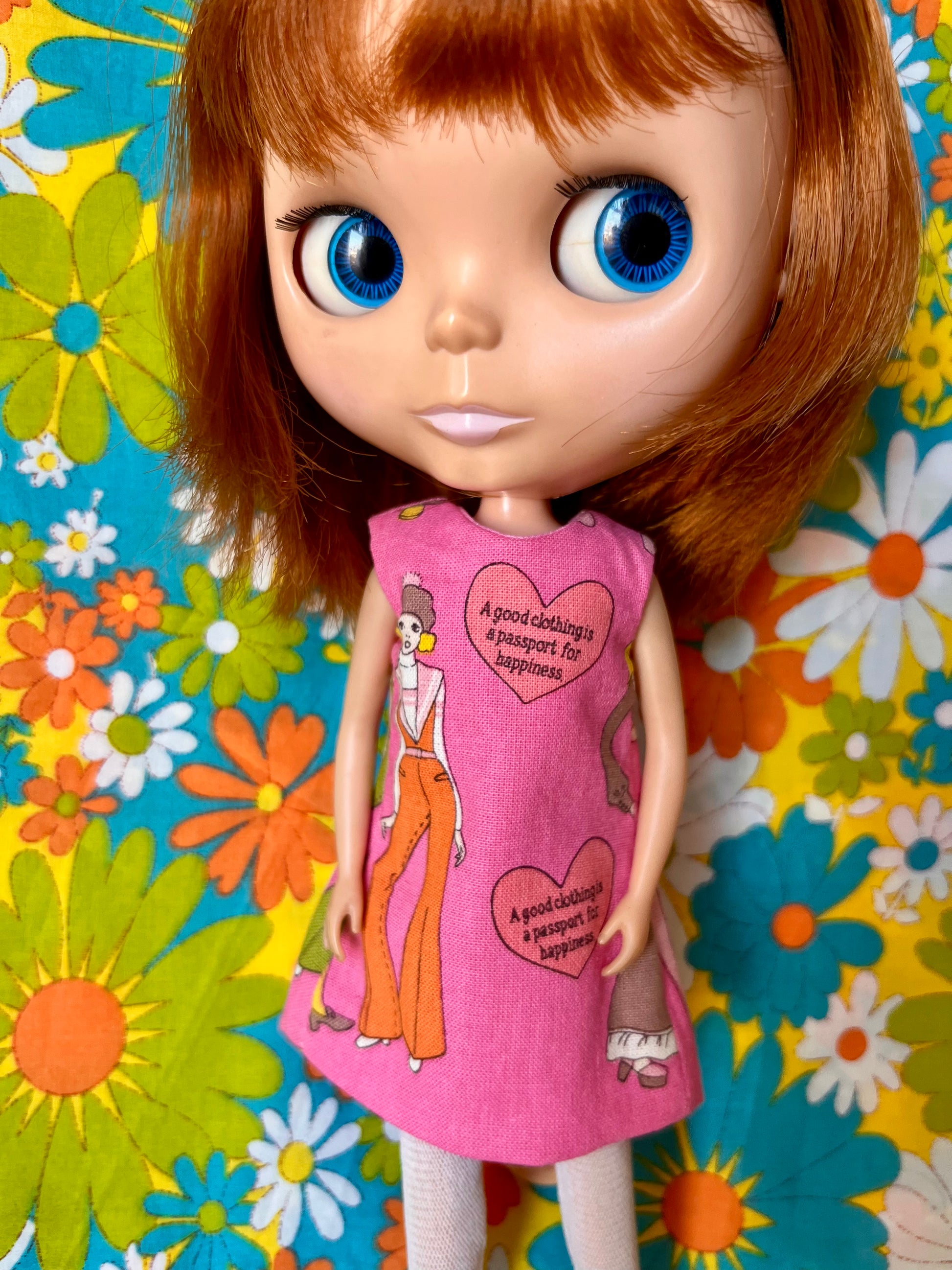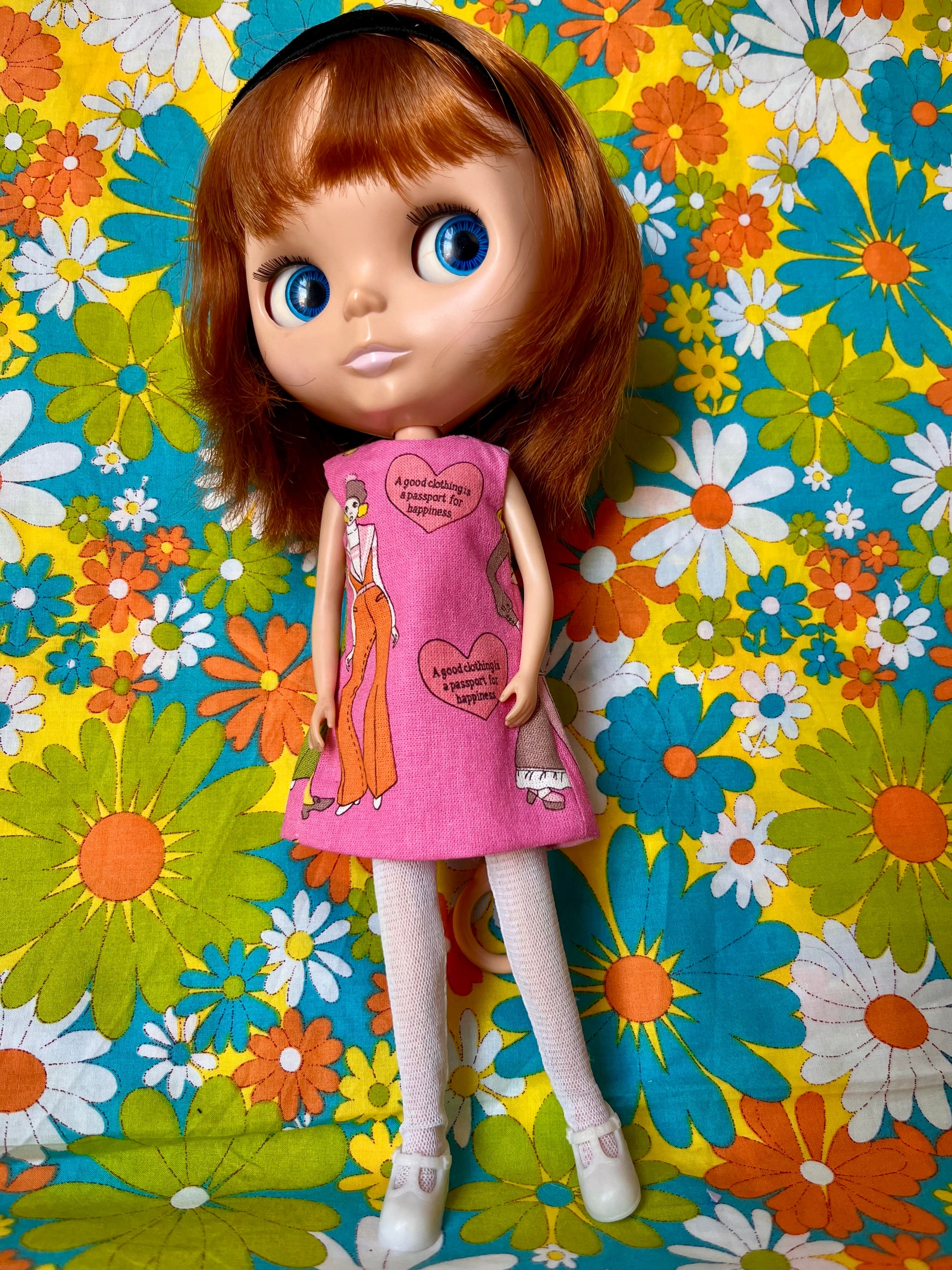🌸 Cilla inspired Mod Sleeveless Shift dress made with pink doll illustrations fabric, with back poppa fastening.