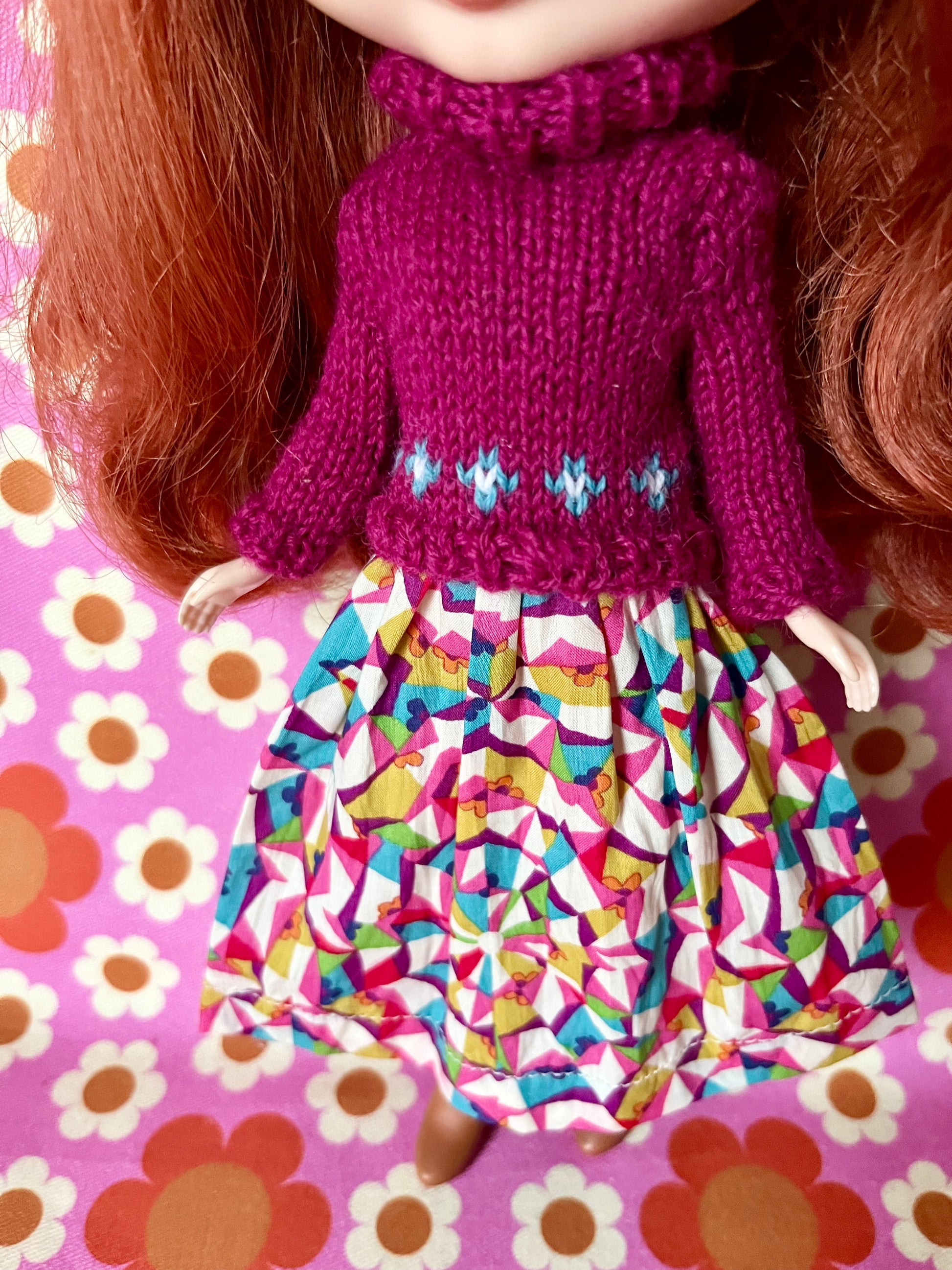 Hand knit sweater in dark pink yarn. Sweater has long sleeves and a roll collar. Knitted around the bottom on the sweater is row of tiny daisy flower motifs in stranded colour work. Fastens at the back with two snaps.