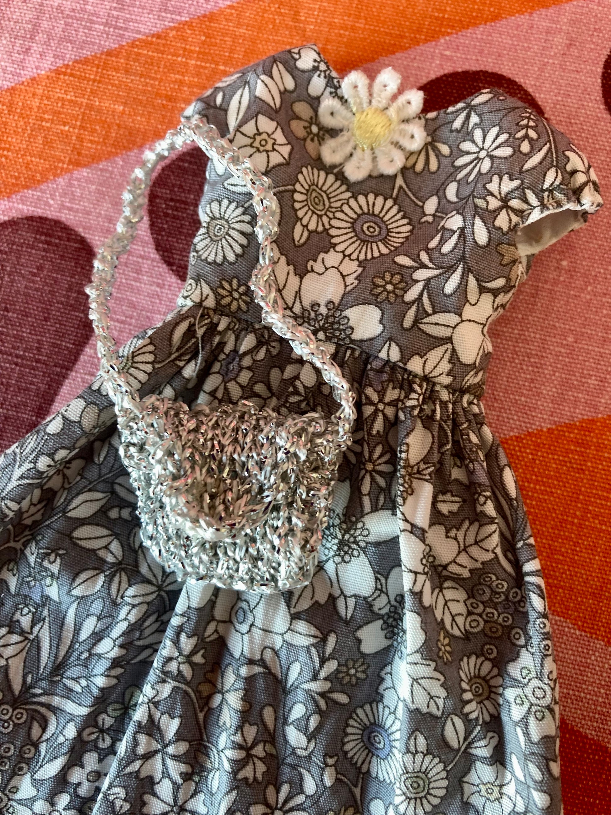 2. knitted Glitter bag in metal in yarn. Envelope style bag with shoulder strap. Bag has a snap fastener and will open and close. There might be a little surprise inside if you are lucky.