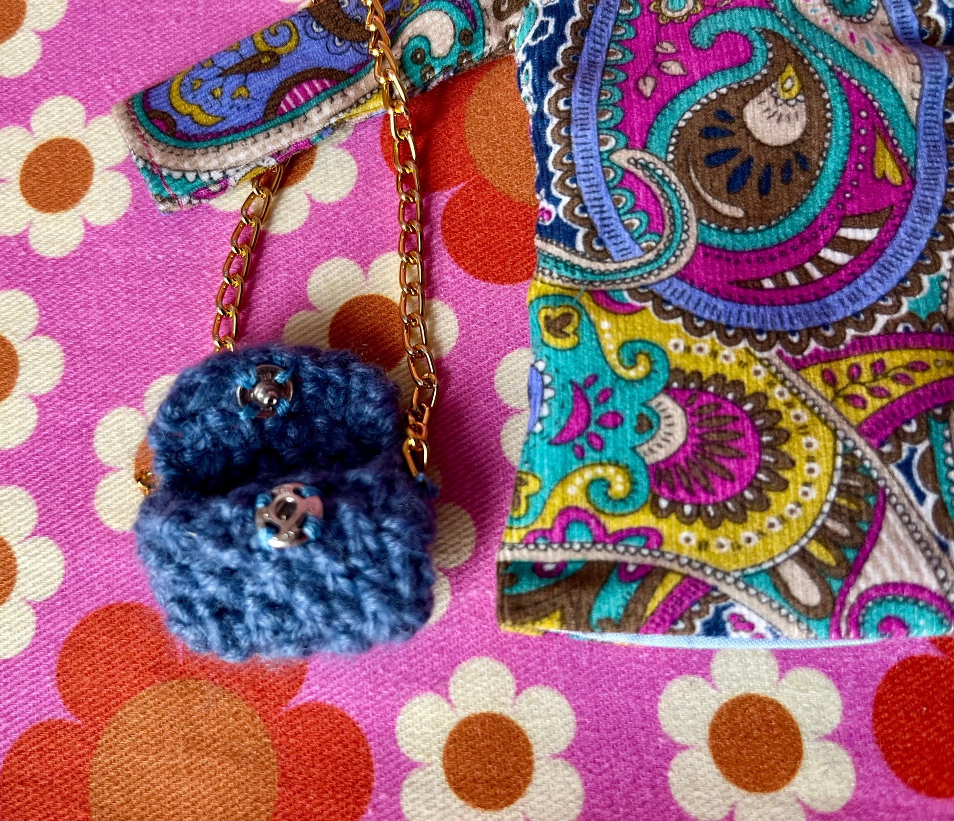👜 Handbag with snap fastener to open and close. Knitted with front button and gold chain handle.